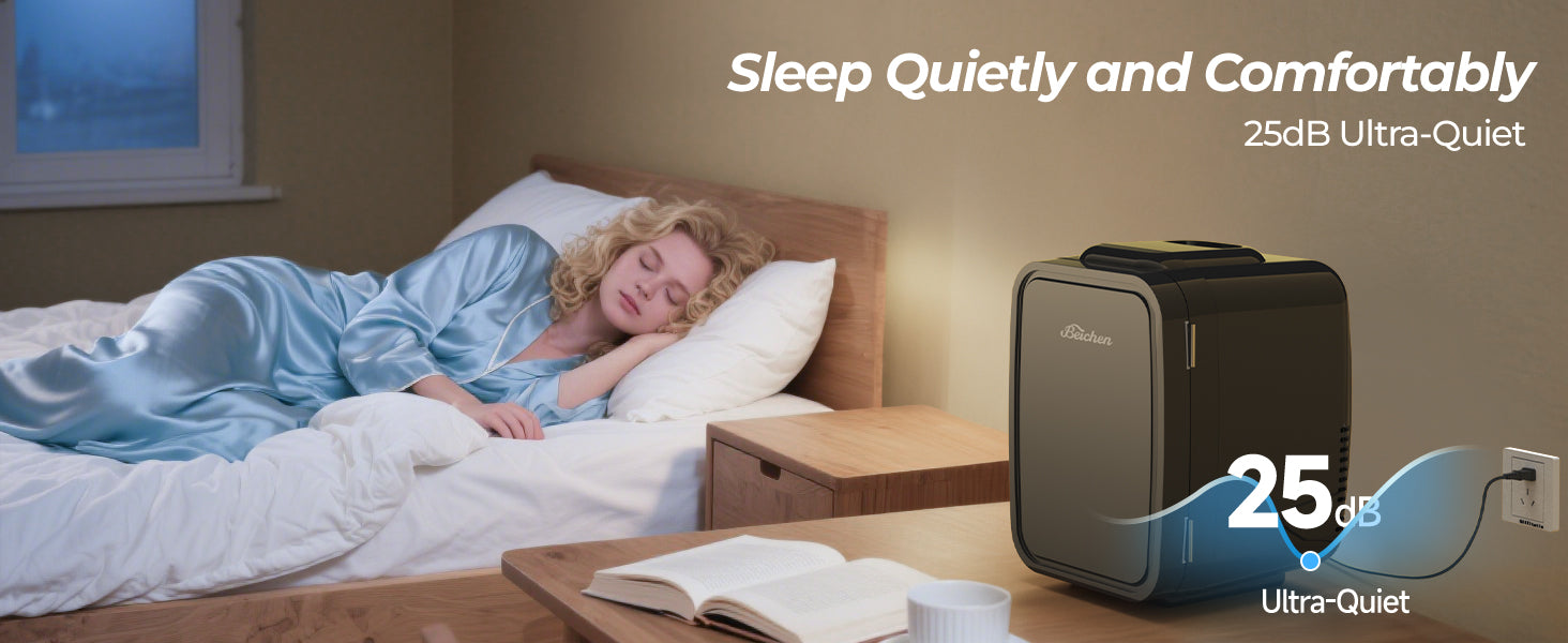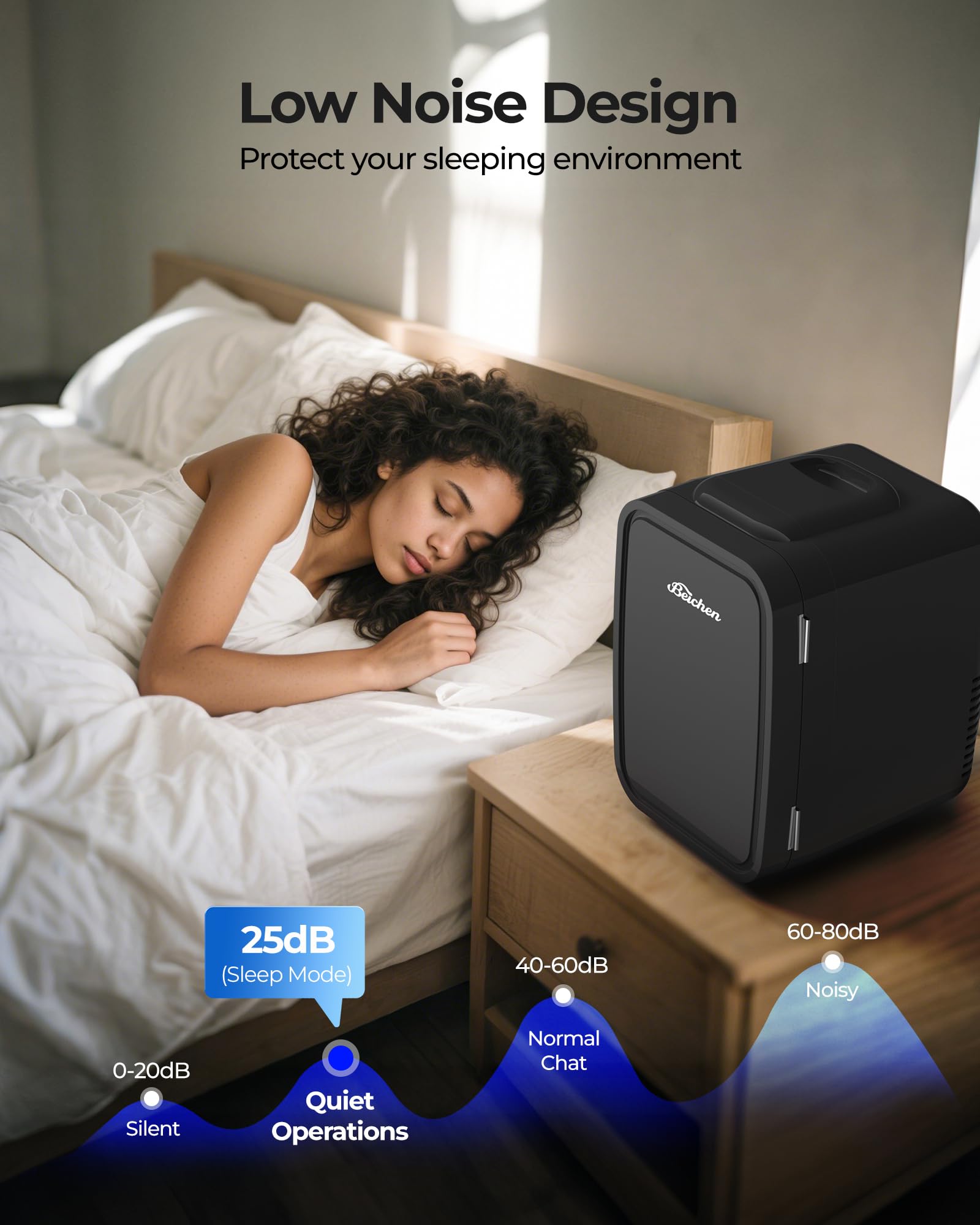 This mini fridge for bedroom features quiet operation under 25 dB and fast, reliable cooling. The 4L compact design fits perfectly on nightstands, desks, or countertops.